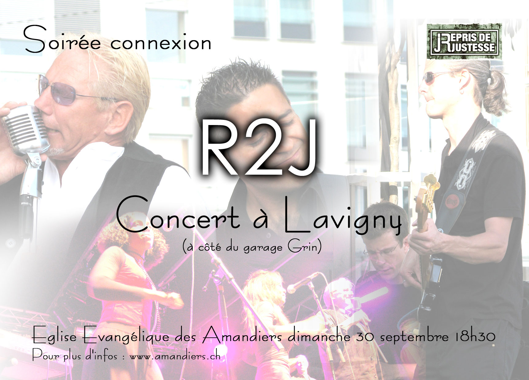 Le 30 septembre, le groupe r2j (pour Repris de justesse) se produira à Lavigny dans le cadre d’une soirée « connexion » organisée par l’Eglise évangélique des Amandiers. Ces musiciens jouent pour les prisonniers et les défavorisés en Suisse comme dans les pays du tiers-monde. Par leur présence, ils souhaitent apporter amour, réconfort et respect. Entre une tournée au Cambodge et en Argentine, r2j donnera un concert à Lavigny.