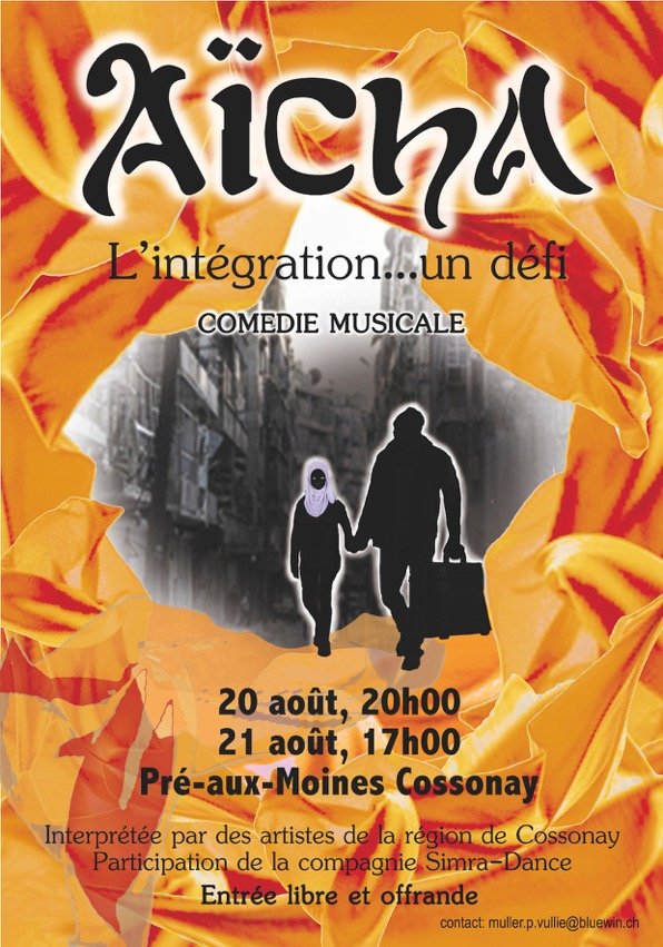 La comédie musicale Aïcha sera jouée pour la première fois les samedi 20 août et dimanche 21 à la grande salle du Pré-aux-Moines à Cossonay. Créé par Anne-France, Marylène et Pierre Muller (texte et musique), Caroline Martinet (danse) et Siméon Freymond (musique), ce spectacle rassemble une vingtaine d'artistes. Il raconte l'histoire d'une musulmane du Moyen-Orient réfugiée en Europe et les difficultés de son intégration.